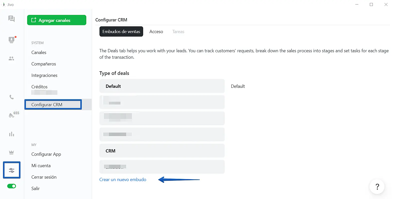 Inicie configurando su embudo de ventas en la aplicación de jivo: puede editar una ya existente o puede añadir una nueva.