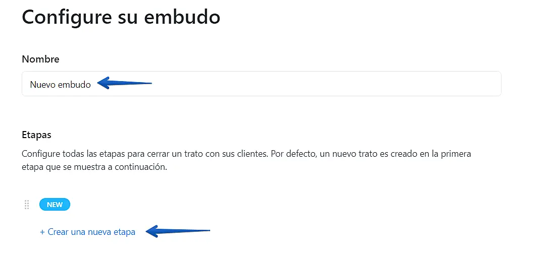 Vaya a Ajustes > Ajustes CRM. Seleccione el embudo a editar y haga clic en ‘Crear un nuevo embudo de ventas’.