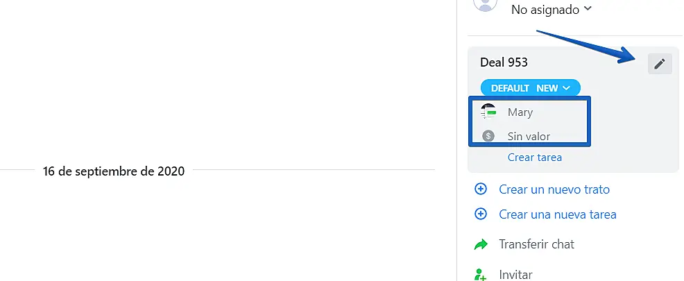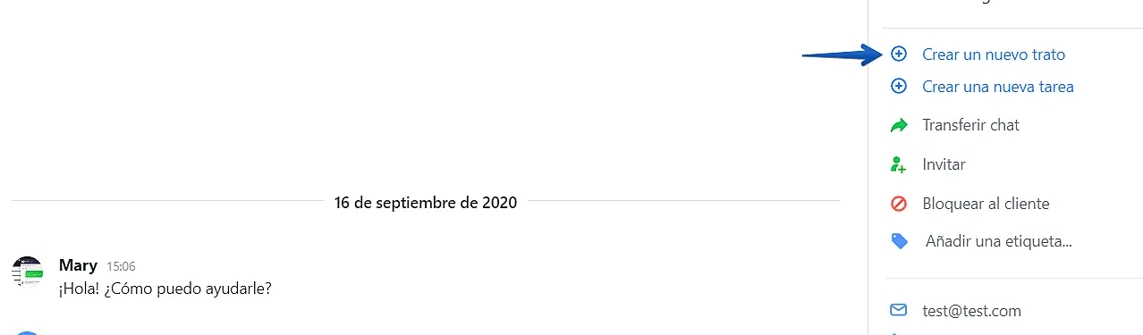 Puede añadir un nuevo trato para un cliente directo desde un chat. Solo haga clic en "Crear un nuevo trato’ en el panel derecho.