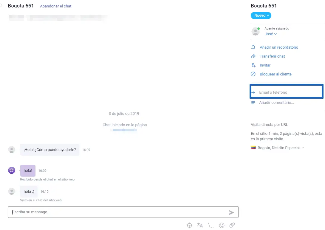 Durante una conversación con el visitante, puede añadir el correo electrónico en el panel derecho junto a los datos del cliente: