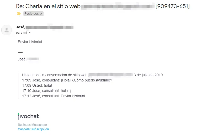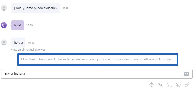 Eso es todo, el historial de la conversación se enviará en 10 minutos al correo del cliente.