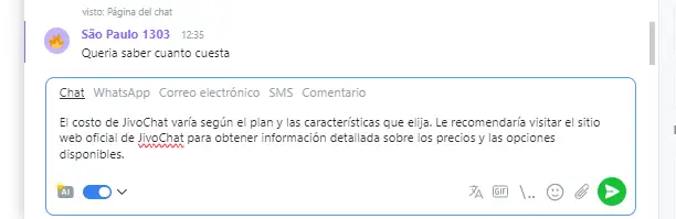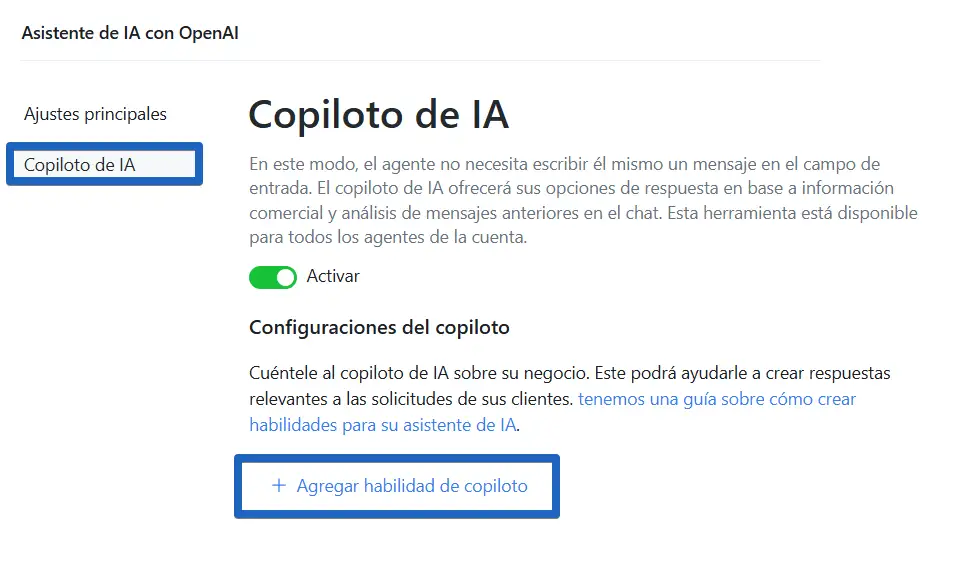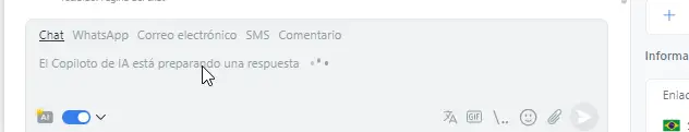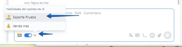 Para generar una respuesta automática en un chat, seleccione la habilidad deseada de la lista y active el interruptor "Copiloto de IA".