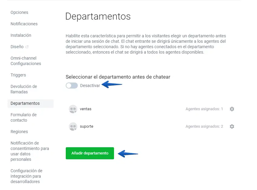 4. Active la opción "seleccionar el departamento antes de chatear" y haga clic en "Añadir departamento"