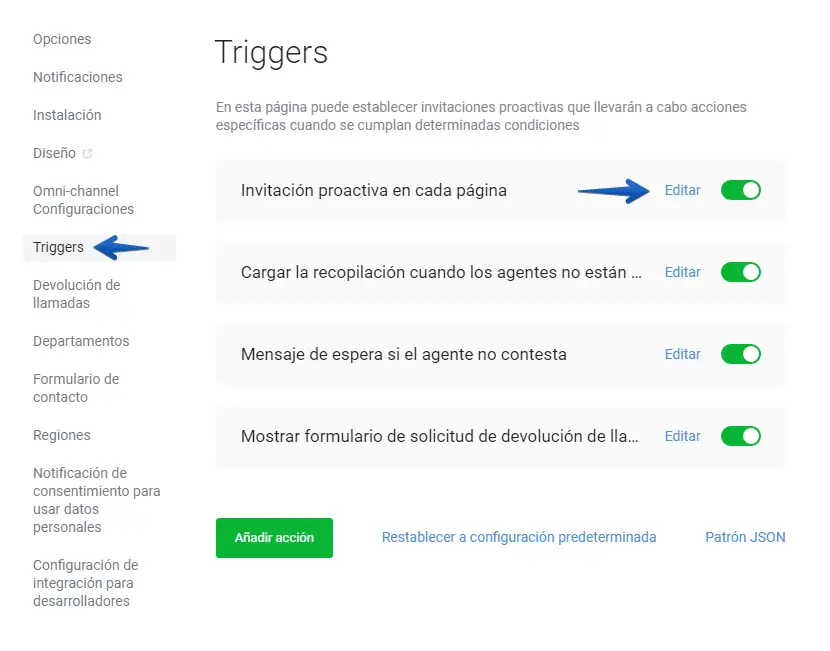 Para el ajuste de invitaciones proactivas para un departamento, vaya a "triggers" y seleccione "Invitación proactiva en cada página" -> "Configurar" (esté trigger viene de forma predeterminada)