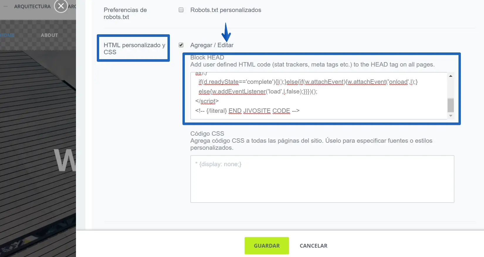 Continúe bajando hasta llegar al menú "HTML personalizado y CSS", haga clic en "EDIT" y pegue el código HTML de JivoChat en el Block HEAD cómo se indica en la imagen: