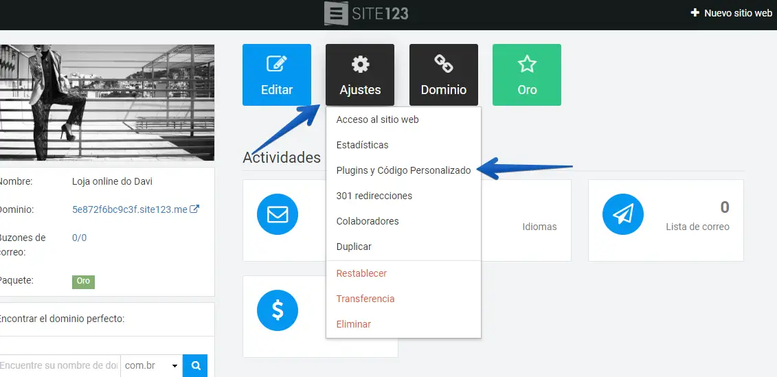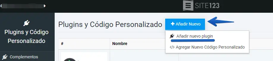 1. Entre en su panel de administrador de SITE123 y vaya hasta Ajustes -> Plugins e Código personalizado.