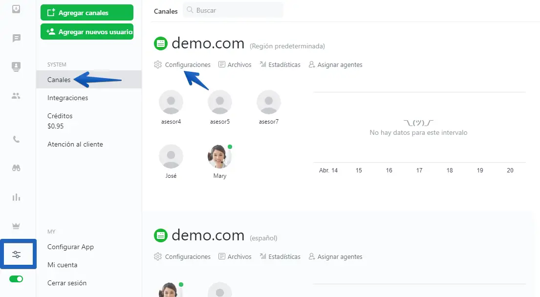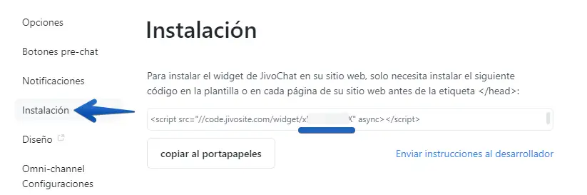 El código de instalación de JivoChat está disponible en la aplicación de JivoChat, en la sección: Ajustes -> Canales -> Configuraciones (debajo del nombre del canal del sitio web).