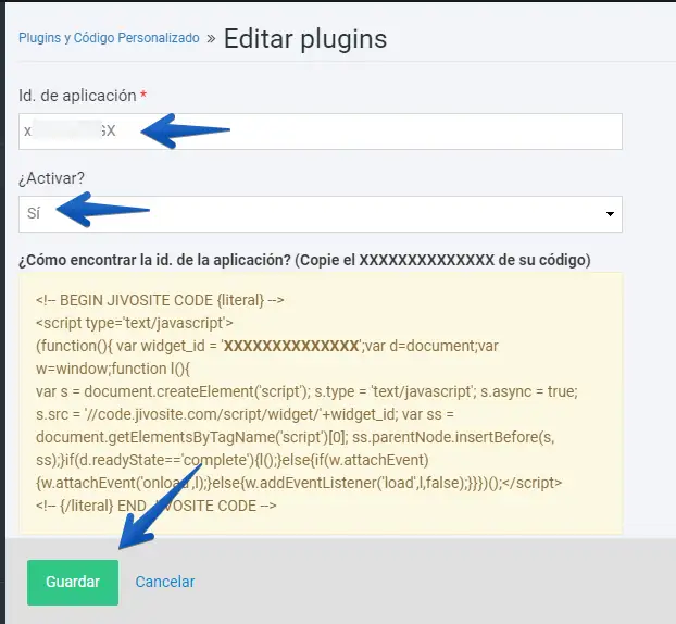 4. En el siguiente paso, tendrá que añadir su ID de Aplicación del chat de JivoChat, o su "widget ID". Este ID se puede encontrar dentro del código de instalación del chat.