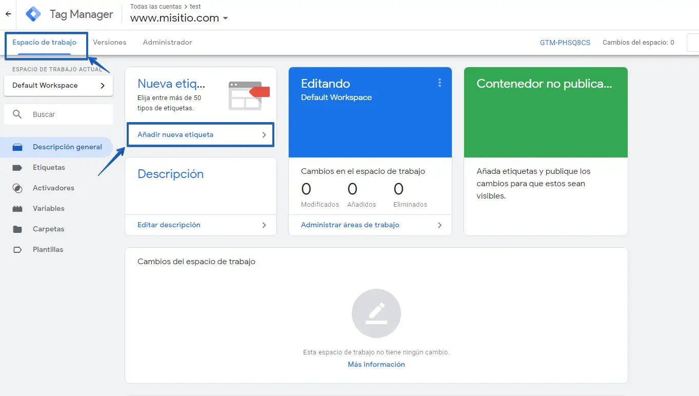 Primero debe iniciar sesión en su panel de Google Tag Manager y haga clic en "Espacio de trabajo" -> "Descripción general"-> "Añadir nueva etiqueta".