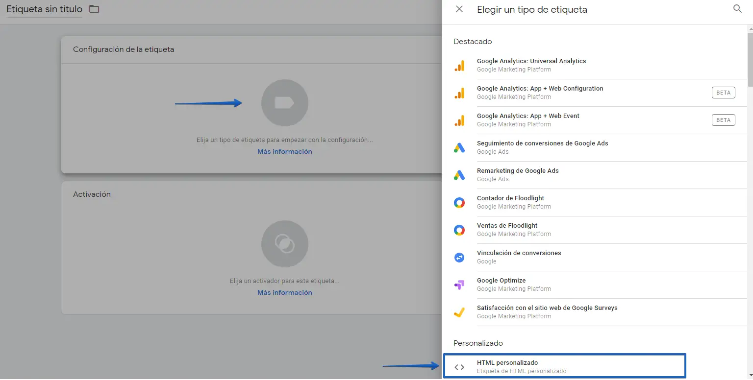 Haga clic para seleccionar el tipo de etiqueta y seleccione la opción "HTML personalizado"