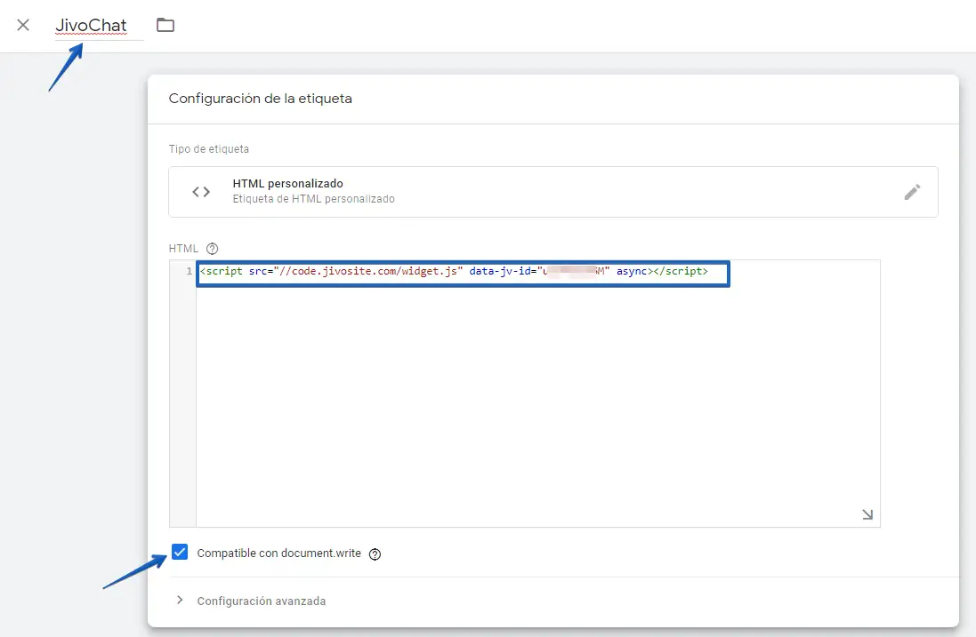 Ingrese el nombre de la etiqueta que está creando, copie el código de instalación de JivoChat en el campo "HTML" y marque la opción "Compatible con document.write "