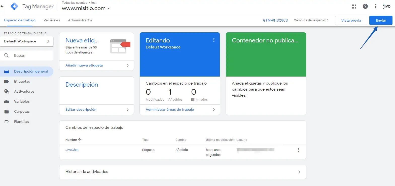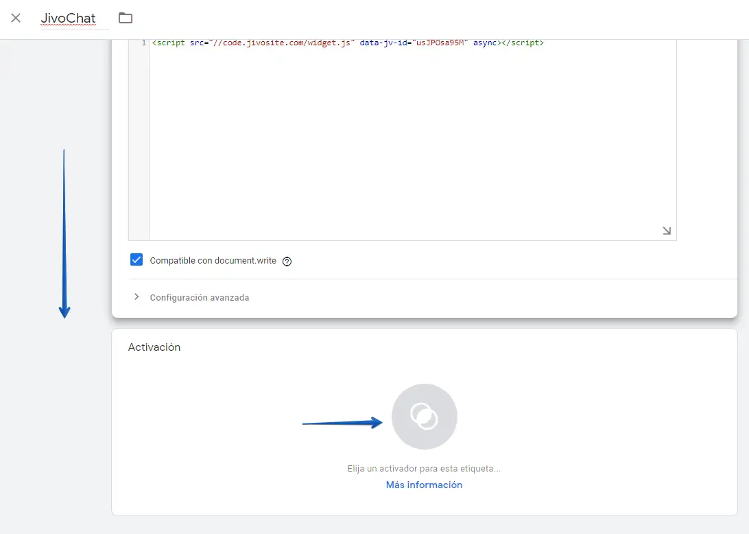 Vamos a dejar esta ventana abierta para seguir con los pasos desde JivoChat y desde google tag manager.