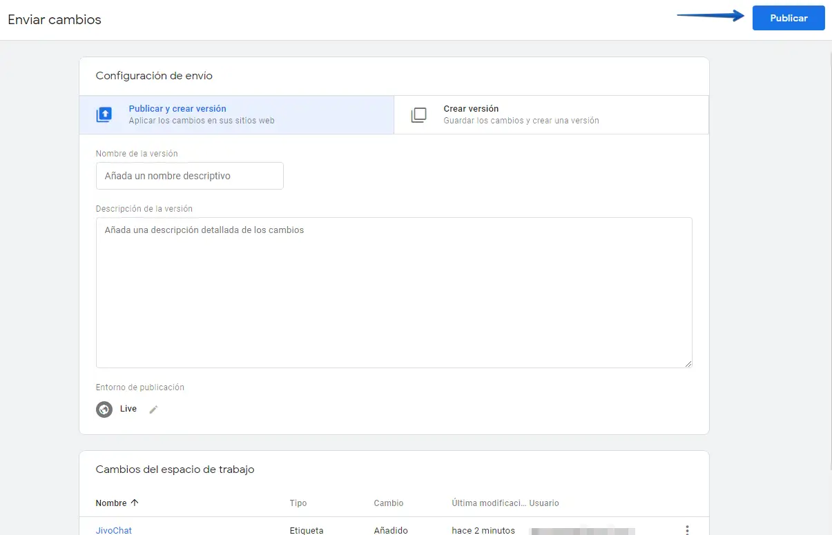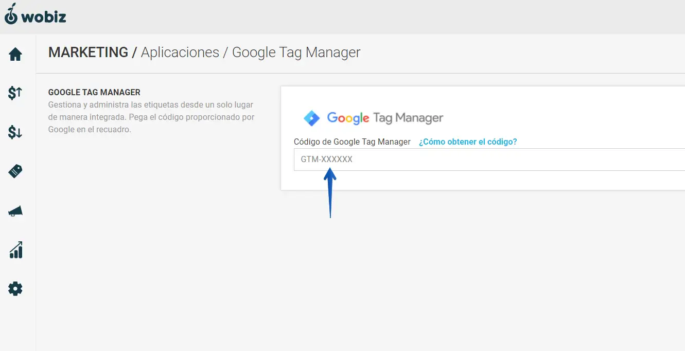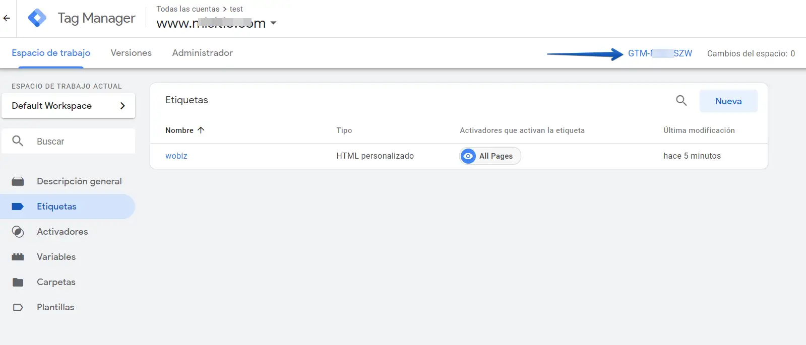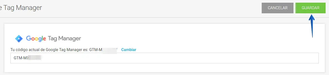 En la siguiente pantalla veremos el campo para añadir nuestro código de google tag manager