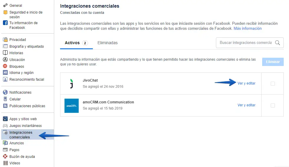 2. Haga clic en "Integraciones comerciales", busque JivoChat en la lista de integraciones conectadas y haga clic en "Ver y editar".