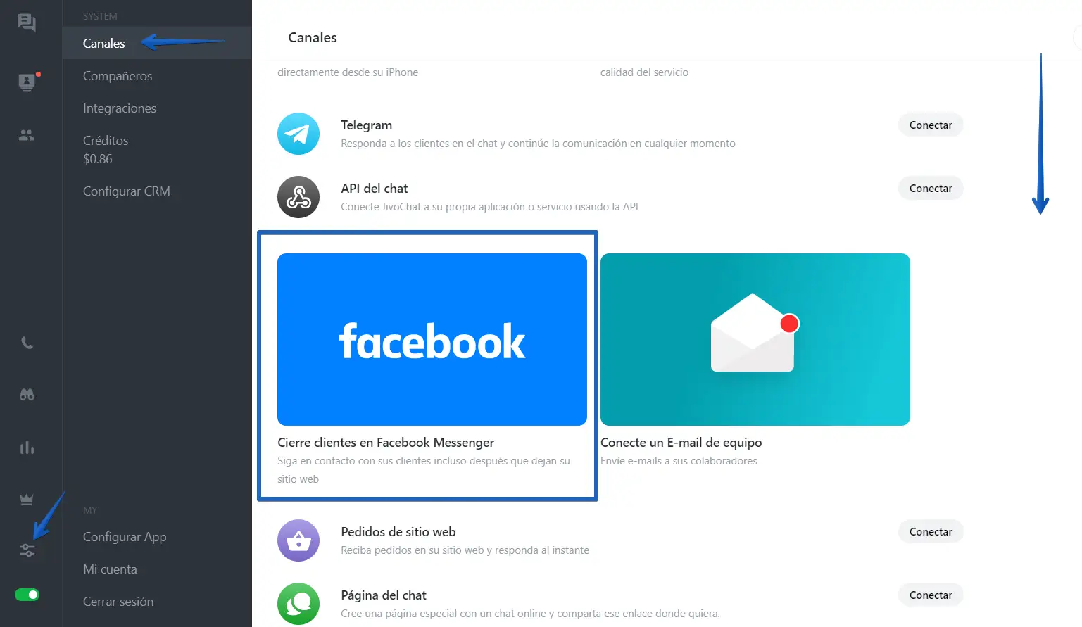 Hemos añadido una integración con páginas de Facebook Esta le permite recibir mensajes de una página de Facebook directamente en su aplicación de jivochat. En primer lugar debe añadir un nuevo canal en nuestra aplicación
