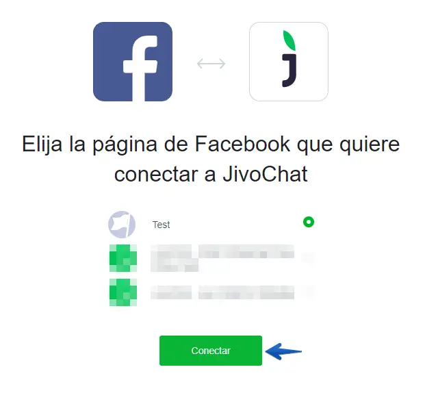 3. Busque lapágina en la lista y seleccionela con el check azul para que JivoChat pueda visuzalar y administrar su página.