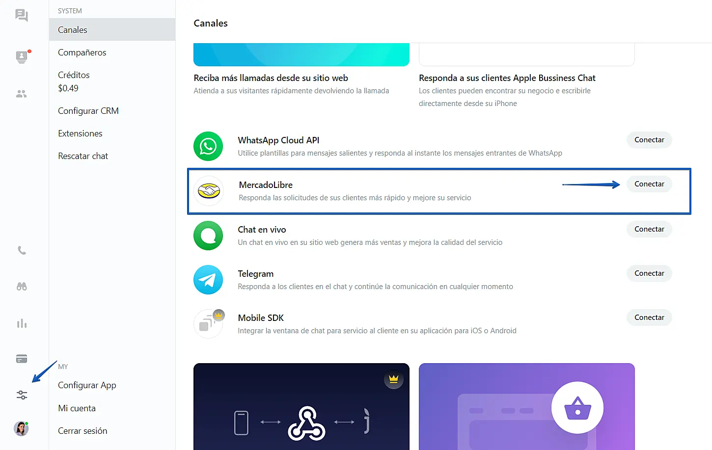 1- Ve a ajustes -> Canales-> y encuentra MercadoLibre: