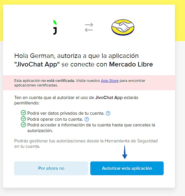 6- Ahora deberá autorizar para vincular nuestra app con MercadoLibre: