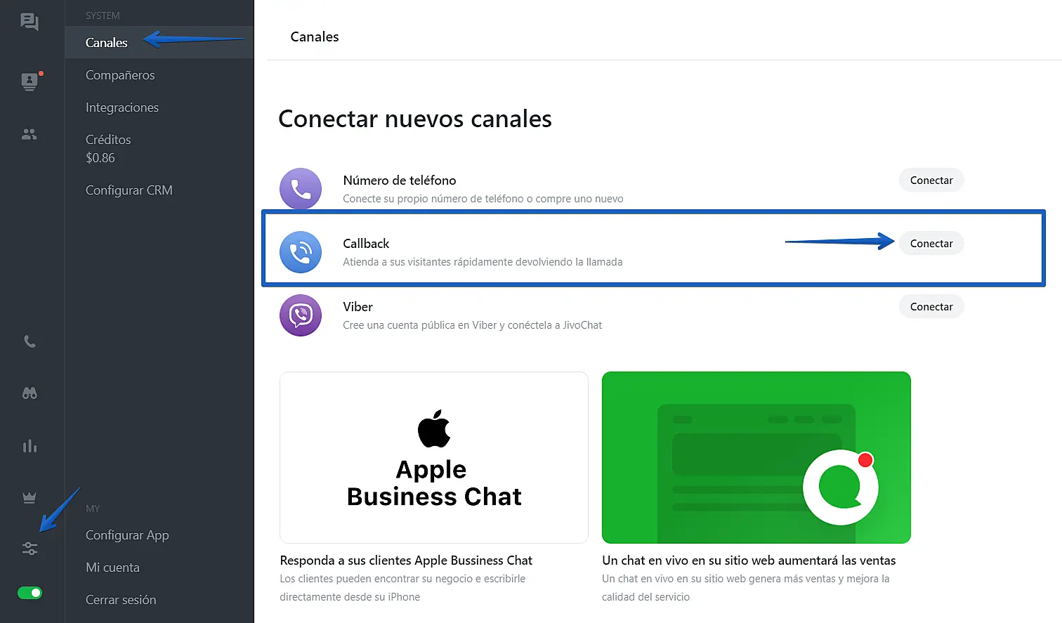Para conectar la función vaya a la aplicación web de jivochat en "Ajustes"-> "Callback":