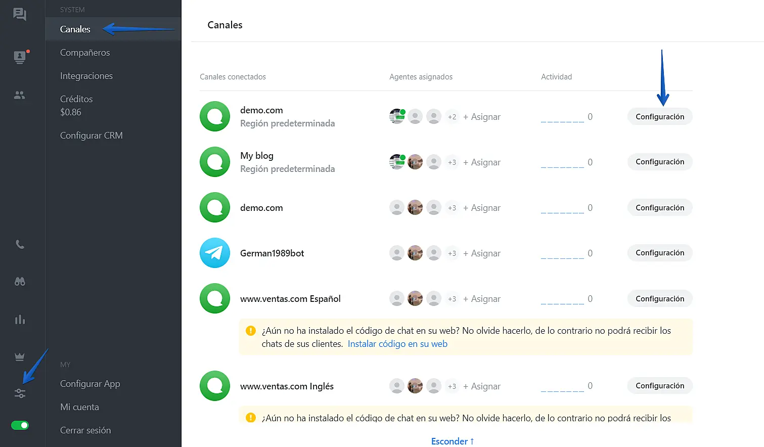 Si lo prefiere, puede ir directo a "Ajustes"-> "Canales"-> "Configuración" del canal:
