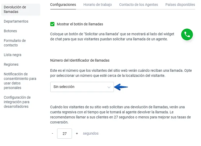 Después de activar la Devolución de llamadas verá una opción para colocar un número que será mostrado a sus clientes cuando reciban la llamada en sus teléfonos. Este es el ID de la llamada, puede utilizar un número ya usado para los operador o añadir uno nuevo