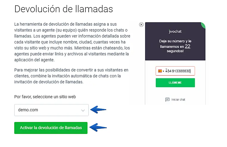 Hemos añadido una nueva e impresionante herramienta a nuestro sitio web para complementar a nuestro asombroso servicio de chat. Con la devolución de llamadas no solo podrá atender a su cliente via chat sino también por teléfono y podrá enviarle archivos al cliente o mensajes en el chat mientras habla con él.