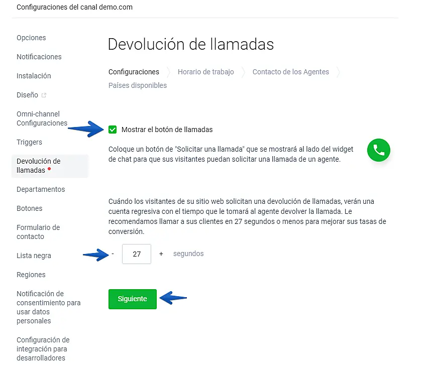 En el siguiente menú vamos a configurar por primera vez la devolución de llamadas: