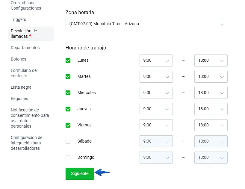 En la siguiente opción podemos seleccionar las horas y los días en que la devolución de llamadas estará activa. (Recuerde cambiar la zona horaria en el menú de configuraciones de su panel opción NOTIFICACIONES ) Seleccione las horas y los días y haga clic siguiente: