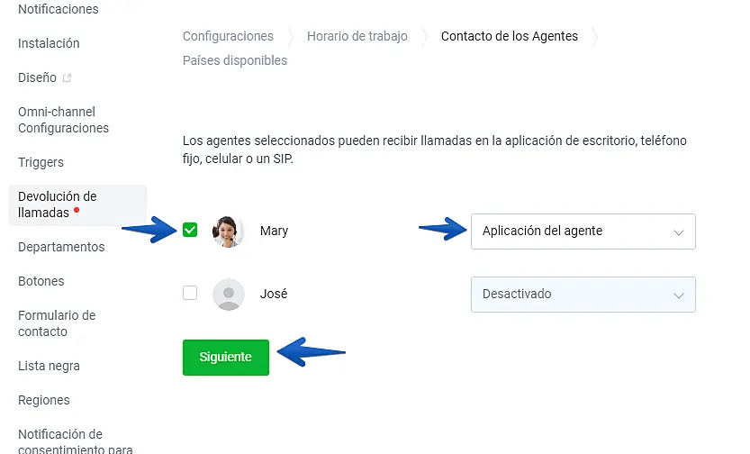 En la siguiente opción puede seleccionar en donde quiere recibir las llamadas. Puede recibirlas en su celular, la aplicación del agente o un teléfono SIP. Escriba su número de teléfono y haga clic en siguiente: