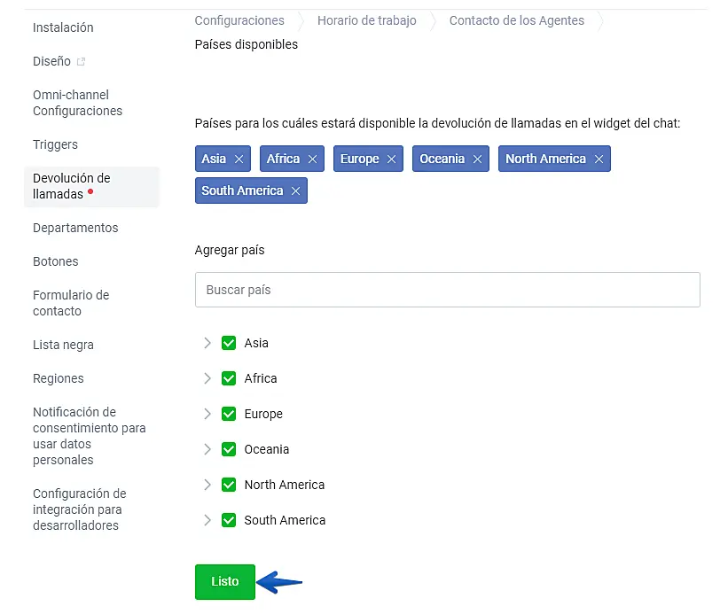 En la última opción puede seleccionar en cuáles países desea que está función esté activa Busque los países y selecciónelos con el check azul. Si quiere elegir Colombia, por ejemplo, debe hacer Clic en South America y ahí le desplegará una lista (vea en la segunda captura de pantalla) Vamos a hacer clic en GUARDAR